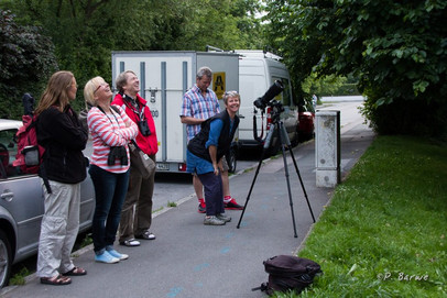 Nach ersten Begehungen im Winter und weiteren am letzten Juni Wochenende wurde schnell klar, dieses Gebiet ist typisch für das Vorkommen von Mauerseglern und auch von Fledermäusen. Jede Fassade wurde angeschaut, jedes Dach nach Ritzen, Spalten und Öffnungen abgesucht. Ein Aufwand, der sich ein professionelles Unternehmen gut bezahlen lassen würde. Im Endeffekt kamen sechs mögliche Häuser als Brutplatz in Frage. Und dort stellten wir uns auf. Bewaffnet mit Ferngläsern, teilweise Fotoapparaten, Proviant und Stühlen, denn es sollte ein langer Abend werden.
