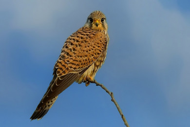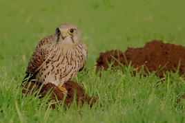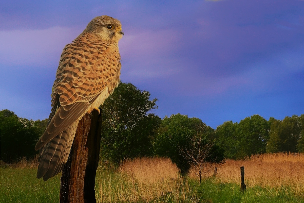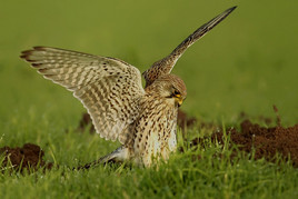 es ist immer wieder ein Erlebnis für den Naturbeobachter zuzusehen, wenn der ausgesprochene Mäusejäger Turmfalke seine Flugeigenschaften geschickt als Jagdstrategien anwendet. Nicht selten sucht er mit seinem außergewöhnlichen Sehvermögen aus ca. 20 bis 30 Metern Höhe im Spähflug Wiesen und gemähte Getreidefelder nach Beute ab. Hat er die Beute im sogenannten Rüttelflug ausfindig gemacht, schwebt der rotbraune Greifvogel bis auf acht bis zehn Metern herab, visiert nochmals seine Beute an, bricht spontan den Rüttelflug ab und setzt zum schneidigen Sturzflug an. Als Beutetier oft eine Feldmaus, welche vor Schreck erstarrt, kaum noch merkt, wenn der Vogel den tödlichen Biss ansetzt. Fast immer mit der Beute im sogenannten „Fang“, so die mit spitzen Krallen versehenen Füße, sucht er dann einen erhöhten Platz oder Pfahl in der Landschaft auf, um in aller Ruhe bei optimaler Umsicht seine Beute zu verzehren.