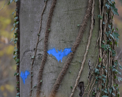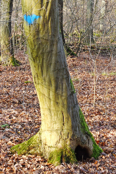 Als Höhlen und potenzielle Fledermausquartiere kommen Spechthöhlen, ausgefaulte Stamm- und Asthöhlen, Stammfußhöhlen, Stammaufrisse, Rindentaschen und -aufrisse usw. infrage. Auch für andere Wirbeltiere und Wirbellose (Käfer, Hornissen etc. ) sind dies wertvolle Mikrohabitate. Die Höhlenbäume wurden mit dem blauen Fledermaussymbol als Habitatbaum markiert und die Koordinaten wurden nach dem UTM-System erfasst. Ebenso wurden Bäume markiert, die einen Brusthöhendurchmesse (BHD) von mehr als 100 cm aufweisen, denn bei ihnen handelt es sich um sogenannte Uraltbäume. Die durch das Fledermaussymbol gekennzeichneten Bäume werden vom Forst nicht gefällt, solange die Wegesicherung nicht dagegenspricht. Insgesamt haben wir 137 Bäume als Habitatbäume ausgewiesen, davon 55 Rotbuchen, 36 Stieleichen, 24 Roteichen, 5 Lärchen, 3 Bergahorn, je 1x Hainbuche, Erle, Kiefer, Esche und Birke.