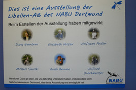 So oder so ähnlich reagieren die meisten Leute auf Libellen. Dabei sind Libellen gar nicht gefährlich, sie besitzen nämlich keinen Stachel. Hätte Familie Müller die Libellenausstellung im Naturkundemuseum Dortmund besucht, wüsste sie das. Die Ausstellung, konzipiert von Diana Goertzen, informiert über diese faszinierenden Insekten und räumt mit Mythen und Vorurteilen auf. Ein sechsköpfiges Team der Libellen-AG des NABU Dortmund mit Guido Bennen, Elisabeth und Wolfgang Postler, Michael Soinski und Wilfried Werkmeister verwirklichte ihre Idee einer Ausstellung über Libellen, die von der Leiterin des Museums, Frau Dr. Dr. Elke Möllmann, begeistert aufgenommen wurde. „Libellen sind sehr ästhetische Tiere. Ich lege mir jetzt auch einen Teich im Garten an, der hoffentlich ein paar Libellen anlocken wird.“