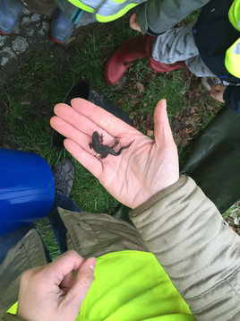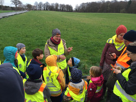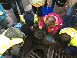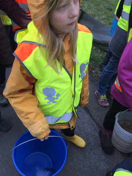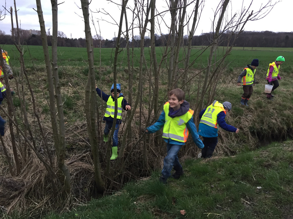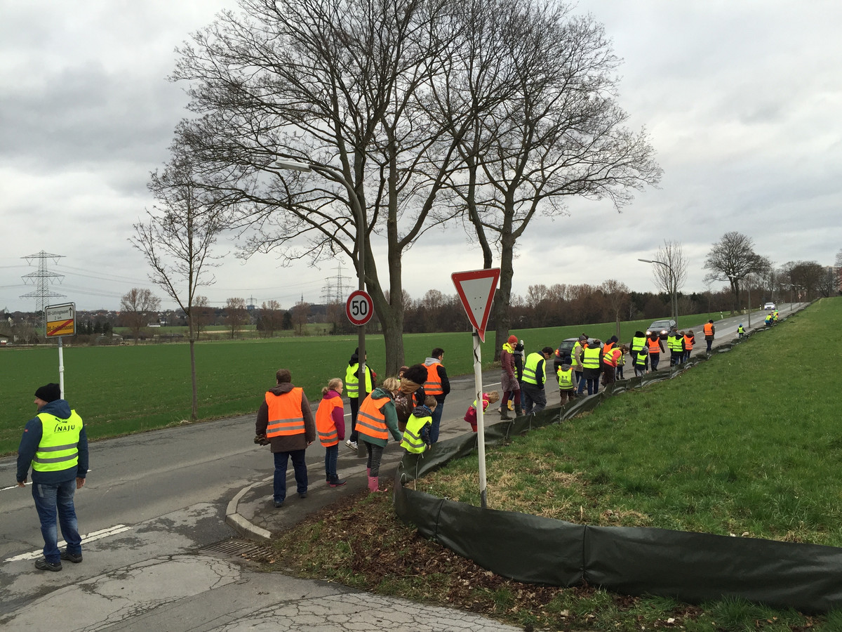 Zusammen mit Steffi Wetzold, der 1. Vorsitzenden von der AGARD, kontrollierten die NABU Kids am Sonntag, den 19.3.17 den Krötenzaun an der Kruckeler Straße. 16 Kinder und 18 Erwachsene ausgerüstet mit Warnwesten, Gummistiefeln und Eimern inspizierten voller Tatendrang die Eimer. Aber leider ließ sich keine einzige Kröte blicken. Sogar der Gullydeckel wurde herausgehoben, um mögliche verirrte Kreaturen zu retten. Ein einsamer Bergmolch erbarmte sich schließlich und ließ sich von den eifrigen Rettern ca. 500m weit im Eimer zum nächsten Gewässer tragen.
