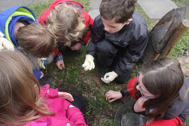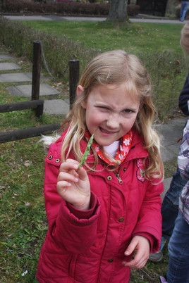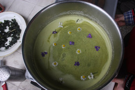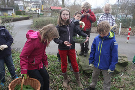 Da unsere Kinderschar über 20 Häupter zählte, ging eine Hälfte zur Gartenarbeit. Die andere suchte mit Andrea Wildkräuter, um daraus kulinarische Köstlichkeiten zu machen. Brennnesseln, Bärlauch, Veilchen, Schafgarbe, Gänseblümchen und Scharbockskraut wuchsen im Gebüsch oder auf der Wiese. Viele fleißige Hände sammelten schnell ganze Körbe voll duftender Kräuter. Daraus stellten wir eine Brennnessel-Bärlauchsuppe, einen grünen Smoothie aus Obst und Wildkräutern und knackige Brennnesselchips her.