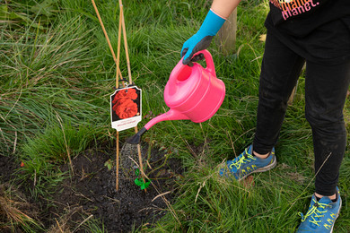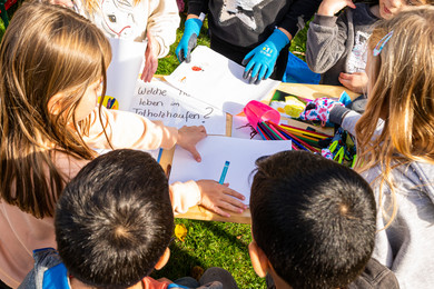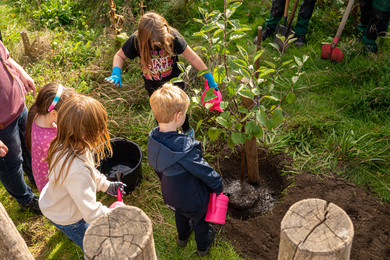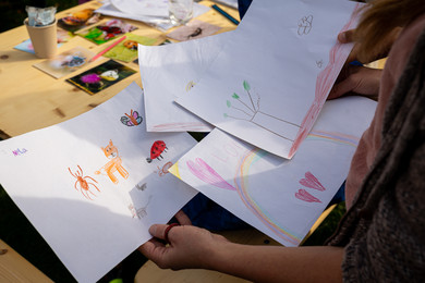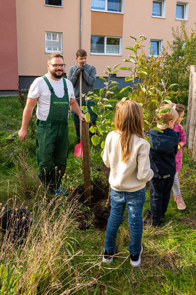 Insgesamt rund 25 Kinder vom Offenen Ganztag der Westhausen-Grundschule und aus dem Wohnquartier besserten die vorhandenen Totholzhaufen aus, verpassten den Johannisbeersträuchern einen Pflegeschnitt, pflanzten Wildrosen am Eingang des PikoParks, lasen mit Greifzangen, Handschuhen und Müllbeuteln ausgestattet herumliegenden Müll auf und malten in Totholz lebende und von ihm profitierende Insekten und Kleintiere, über die sie zuvor einiges erfuhren. Zum krönenden Abschluss pflanzten die Kinder gemeinsam mit den Vonovia-Gärtner*innen und den NABU-Expert*innen einen Apfelbaum hinter die Mosaikbank im PikoPark.