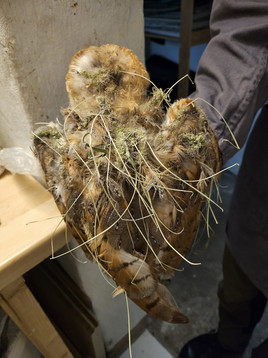 Damit diese Prozedur halbwegs zu ertragen ist, haben wir der Eule Schmerzmittel gegeben und mehrmals am Tag jeweils nur maximal 20 Minuten versucht, einen Teil der Kletten zu entfernen. Es waren kleinste Menge, die wir herausschneiden konnten. An den Flügeln haben wir gesehen, dass die Oberarmknochen bereits ohne Haut waren, weil die Kletten den Flügelrand umschlossen haben. Sie hat sicherlich auch selbst versucht, sich von den Samenkletten zu befreien. Diese feine pergamentartige Haut an den Flügelknochen regeneriert sich nicht. So haben wir uns entschieden, sie am nächsten Tag vom Tierarzt erlösen zu lassen. Die Schleiereule ist in der Nacht zu Montag, den 2.Sept. 2024, verstorben.