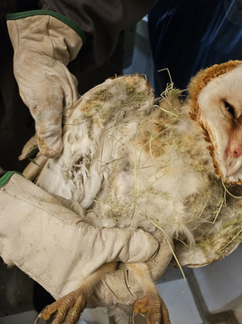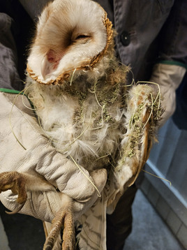 Am Samstag, den 31. Aug 2024 hat die Vogelpflegestation eine Schleiereule bekommen, in deren Gefieder sich mehrlagig Samenkletten des Quirl-Borstengrases (Setaria vertillicata) bis auf die Haut eingearbeitet hatten.