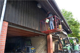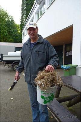 zuerst einmal eine lange Leiter, die uns vom Zoo zur Verfügung gestellt wird und meldeten uns bei der Zoo Leitung an. Dafür an dieser Stelle auch noch einmal herzlichen Dank, macht es uns doch die Arbeit um vieles leichter wenn wir nicht noch die große Leiter mitbringen müssen. Die ersten Kästen die es immer zu reinigen gilt sind die Spatzenhäuser direkt im Betriebshof des Zoos. Diese hängen allerdings so hoch das es starke Nerven braucht sie mit der Leiter zu erreichen. Kurzerhand brachte einer der Zooangestellten einen Trecker und hob Neil damit in luftige Höhen. Auf diese Weise war es um einiges einfacher die Kästen zu reinigen. Noch während der Reinigungsaktion der gut gefüllten Kasten kamen die ersten Spatzen herbei und schauten nach was mit Ihrer Unterkunft geschah. Viele bunte Ferdern von exotischen Vögeln die im Zoo leben und viel Stroh füllen hier die Nistkästen. Wir trafen hier auch unser NABU Mitglied Dirk Lehmhaus der an diesem Morgen aus dem Zoo den