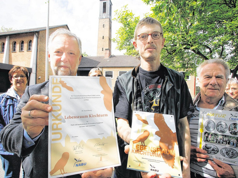 Der NABU setzt sich mit der Aktion „Lebensraum Kirchturm“ für die Sicherung von Nistplätzen bedrohter Arten ein. Bundesweit werden Kirchen, die sich besonders für den Artenschutz einsetzen, mit einer Urkunde ausgezeichnet und erhalten eine Plakette, die sie an ihrer Kirche anbringen können.